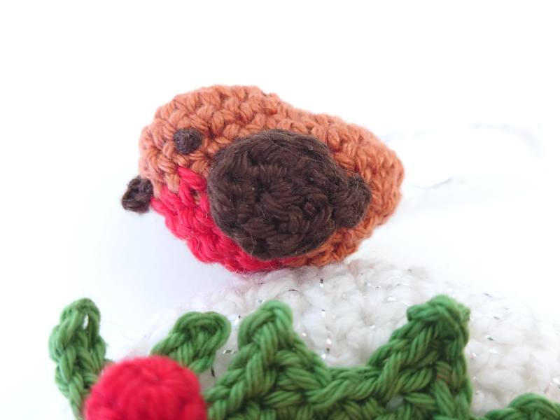 If making Holly leaves, I like to add small red berries between the leaves for a traditional touch. To do this crochet a ch4 loop or magic ring in red yarn, crochet 6sc into the centre then work 2 rounds of 1sc in each stitch around. Fasten off and sew remaining hole closed.